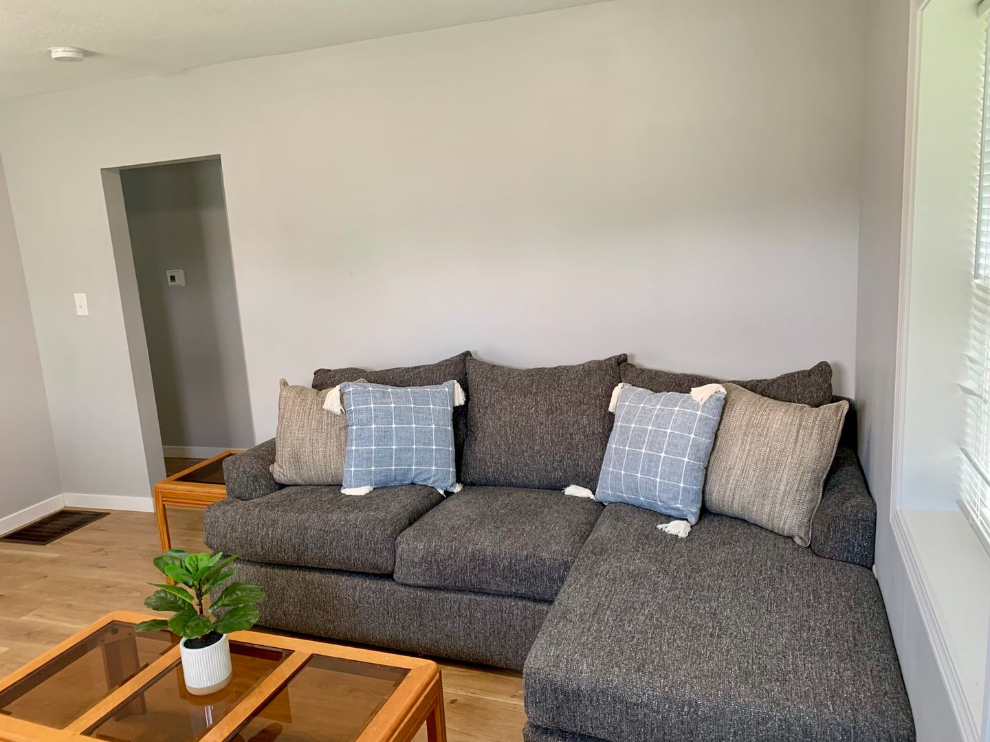 Relaxing Living Area: Unwind in the cozy living room with a brand-new sectional sofa and a flat-screen TV for your entertainment.