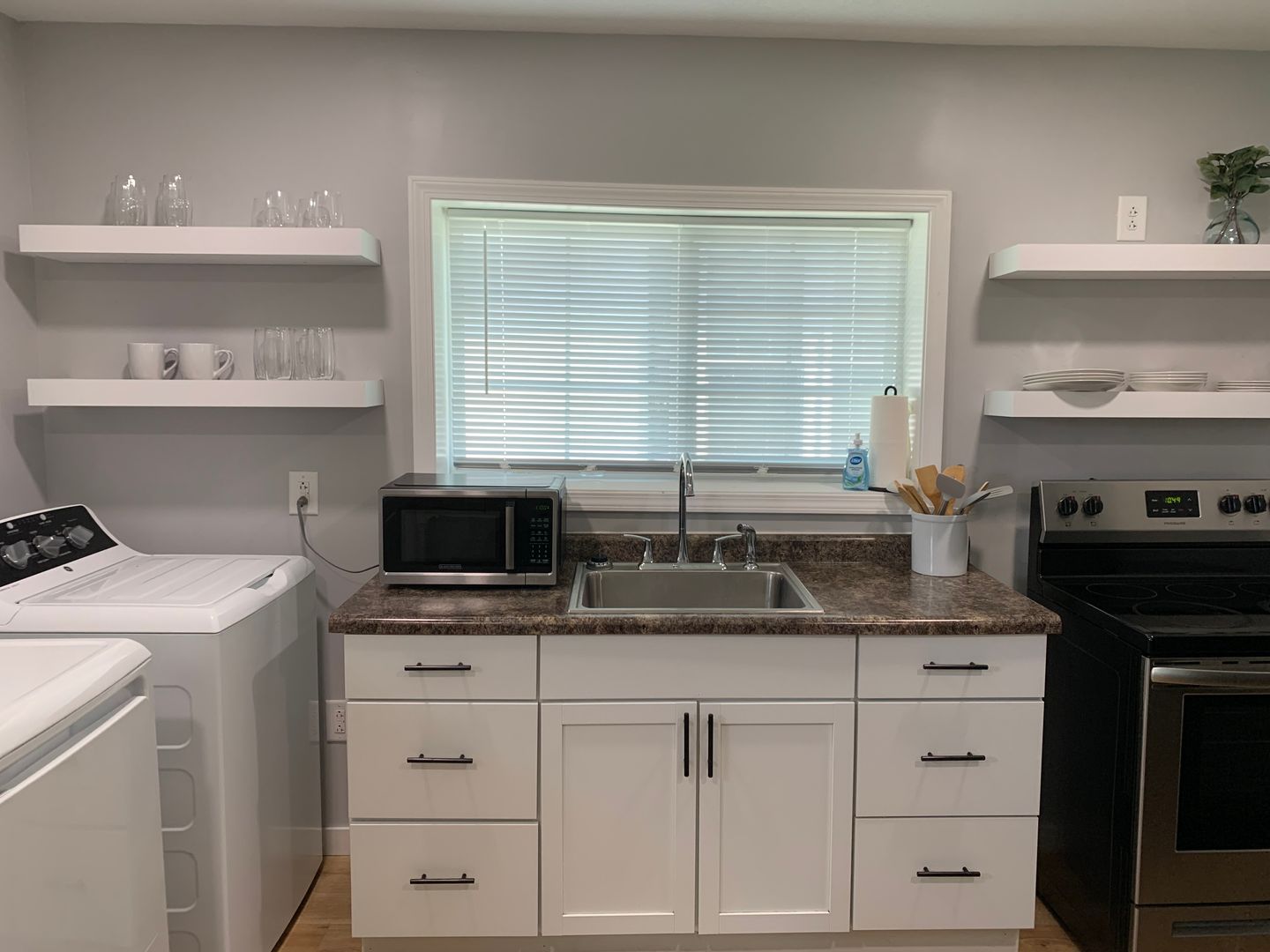 Fully Equipped Kitchen: Enjoy cooking your favorite meals with a full-size fridge, stove/oven, coffee pot, toaster, microwave, and a complete set of dishes, utensils, and cookware.